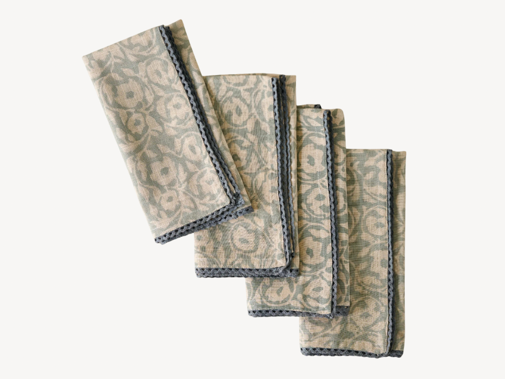 These linen napkins feature a block-printed floral pattern and crocheted scalloped edges. They’re machine washable, making them easy to use as a daily luxury.