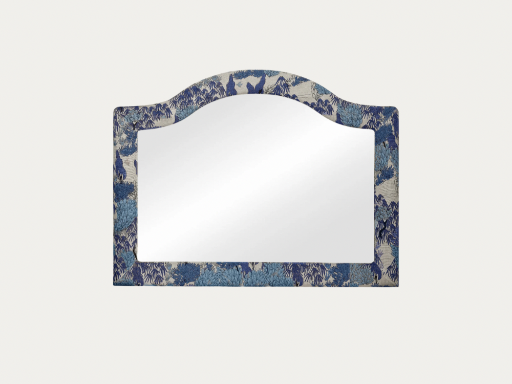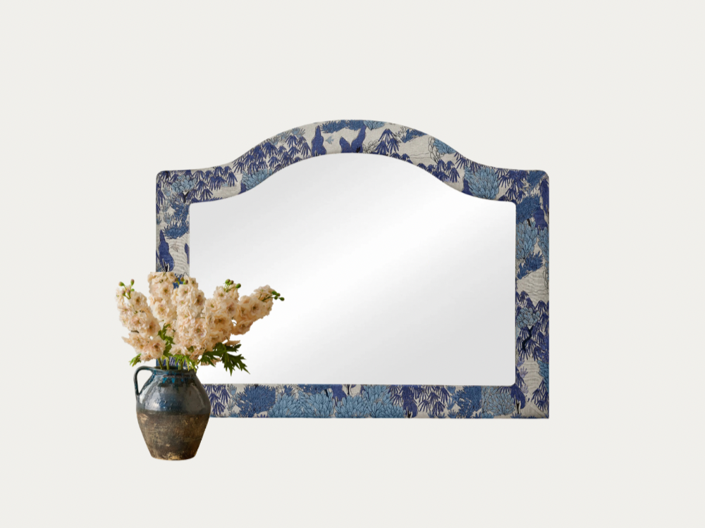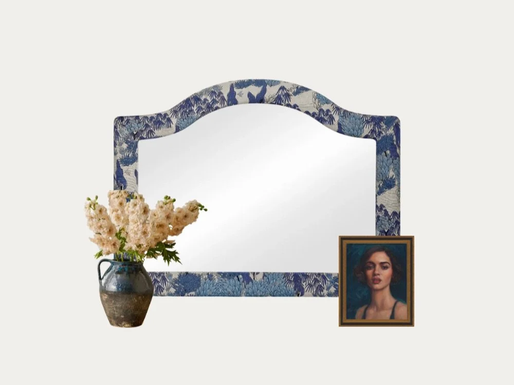 To start, I’ll center everything around a ridiculously gorgeous arched mirror upholstered in a blue-and-white pattern. This is my core piece.