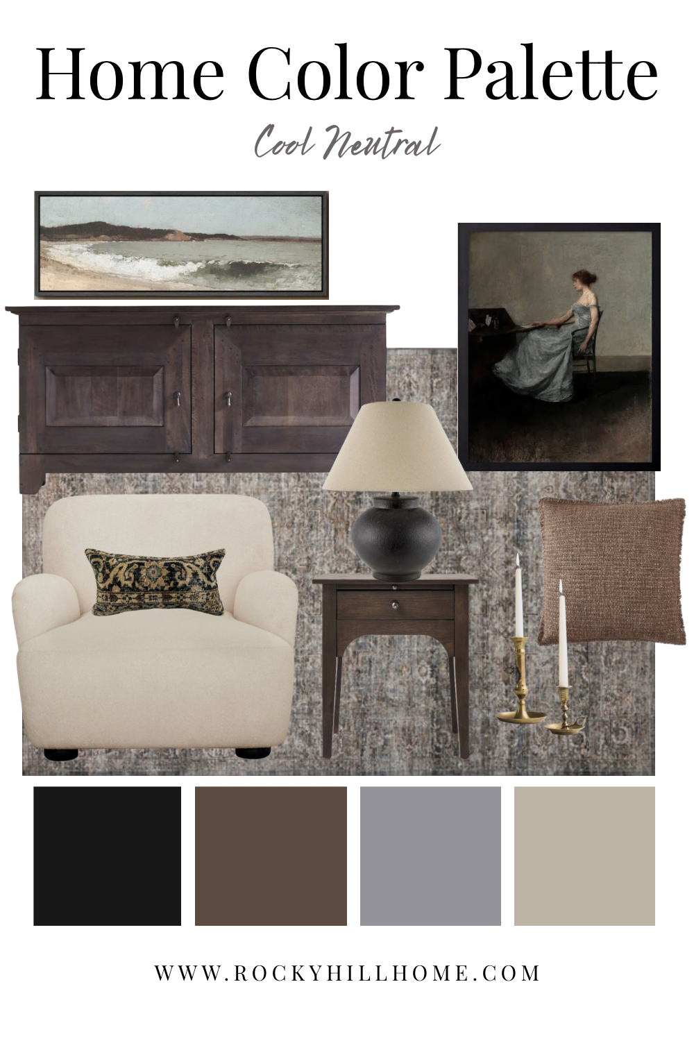 If you’re drawn to soft, serene spaces, the cool neutral palette may be the one for you. Here, taupe and brown anchor the scheme, while muted blue-gray adds a cool undertone. The cream chair and vintage-inspired rug balance the darker wood cabinet and black accents, creating a quiet but elevated look.