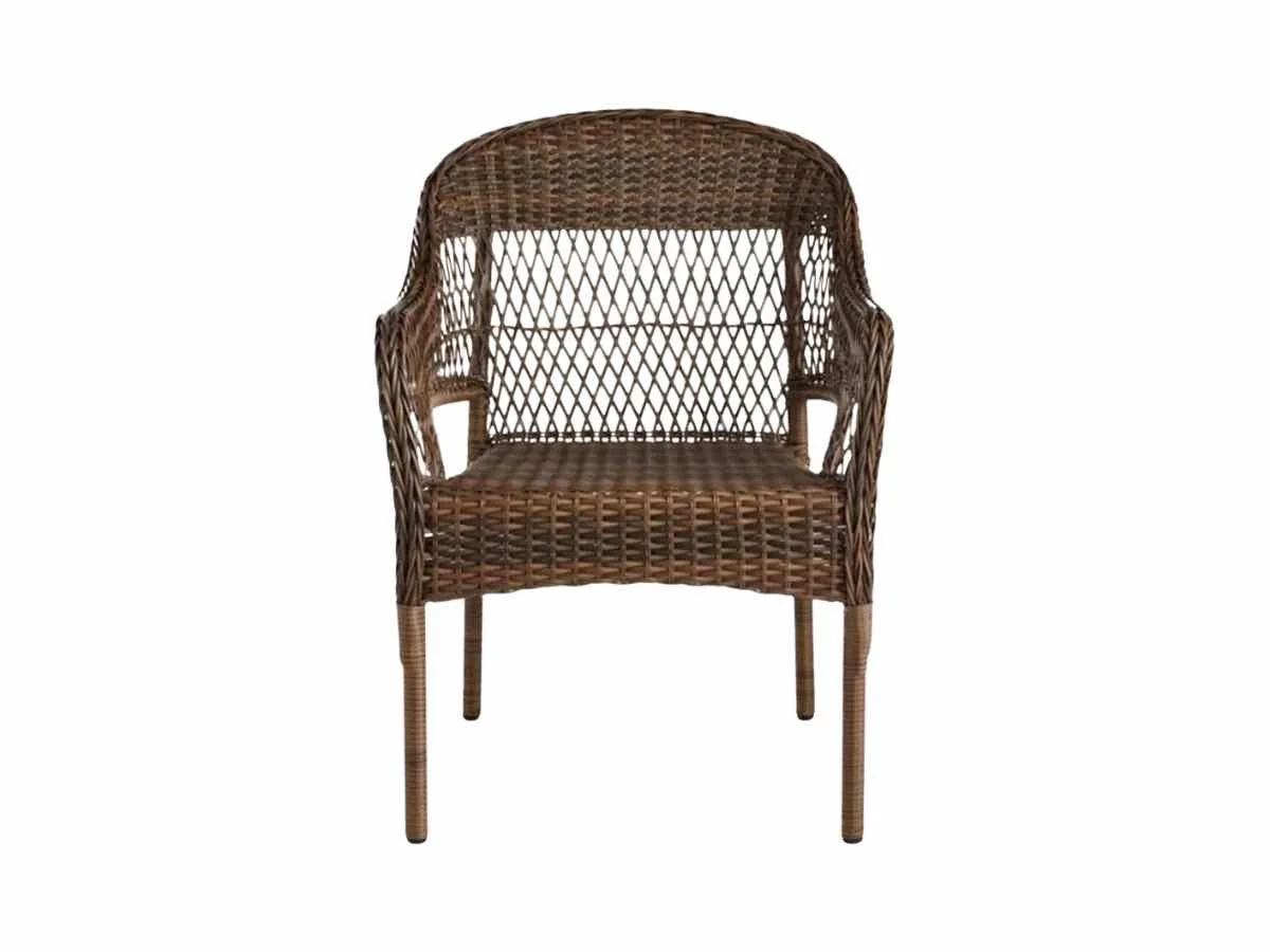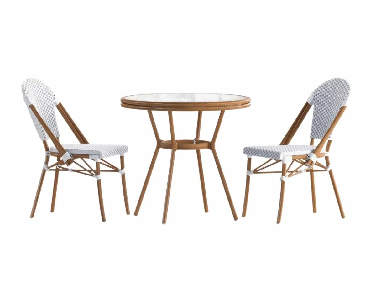 A pair of slim-profile wicker bistro chairs or a single wicker chair creates a focal point without blocking the flow of traffic. To keep the setup feeling lighter, stick with open-weave designs, and leggy pieces. This lets your eye move through the furniture and helps the small outdoor area feel less heavy.