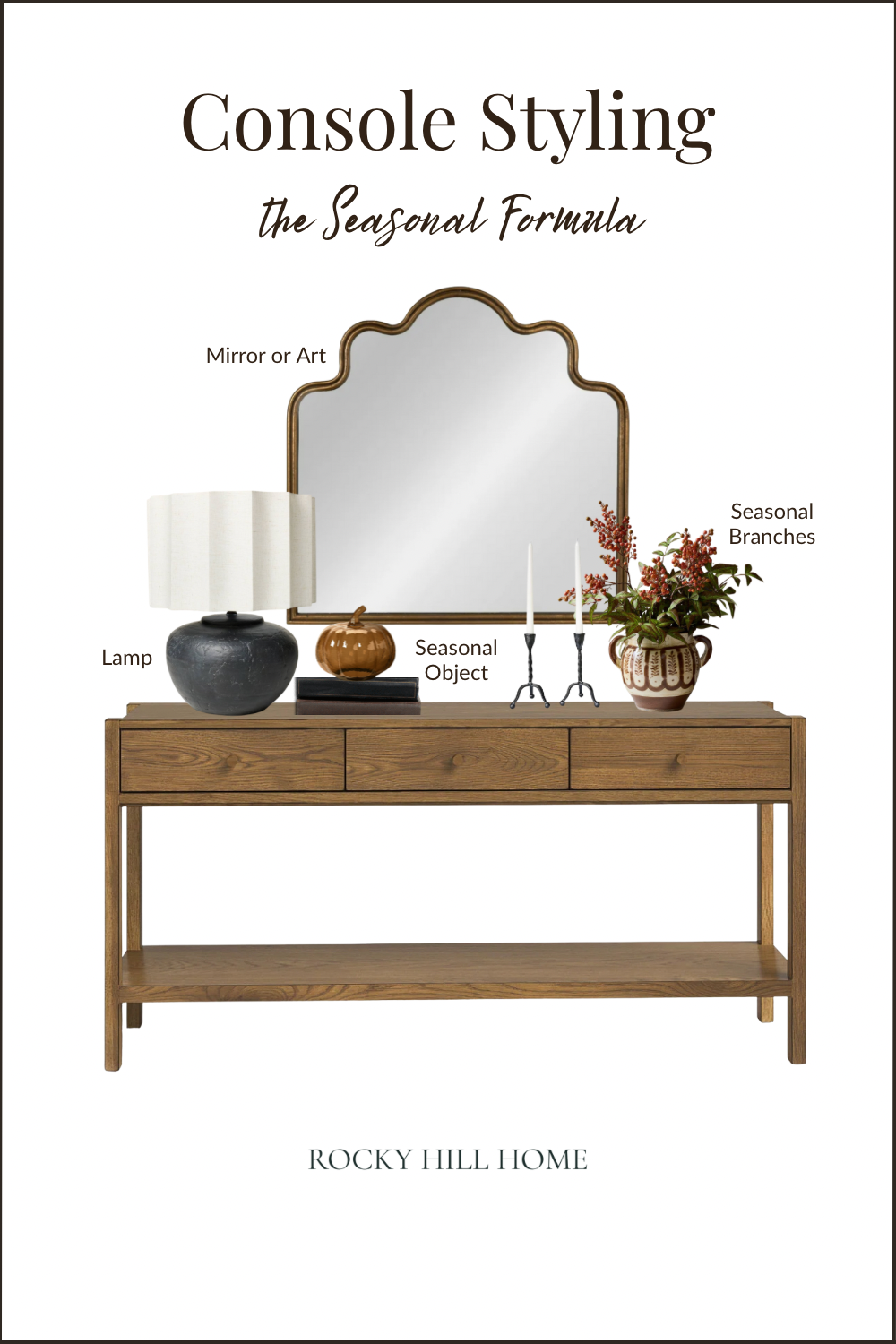 This formula lets you refresh your console table throughout the year without buying new. Keep your base pieces simple, like a neutral lamp, a mirror, and a small stack of books, and swap in seasonal accents.